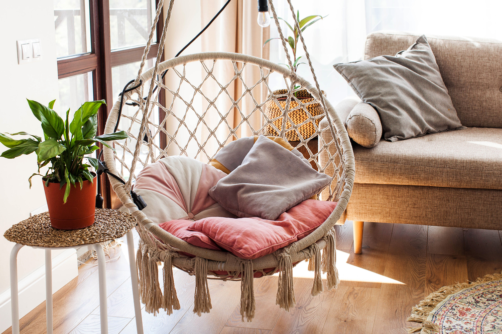 Before you dismiss swings as impractical or childish, hear us out – they are fun, aesthetic, and we would all want one if we got the chance! Hanging beds, rattan swingasans, macrame hammocks, cocoon swing chairs, weaved tyre swings, or solid wood swings with shaggy cushions make the perfect addition to the boho vibe of your home. Give it a try if you have the space for it, and you won’t regret it.