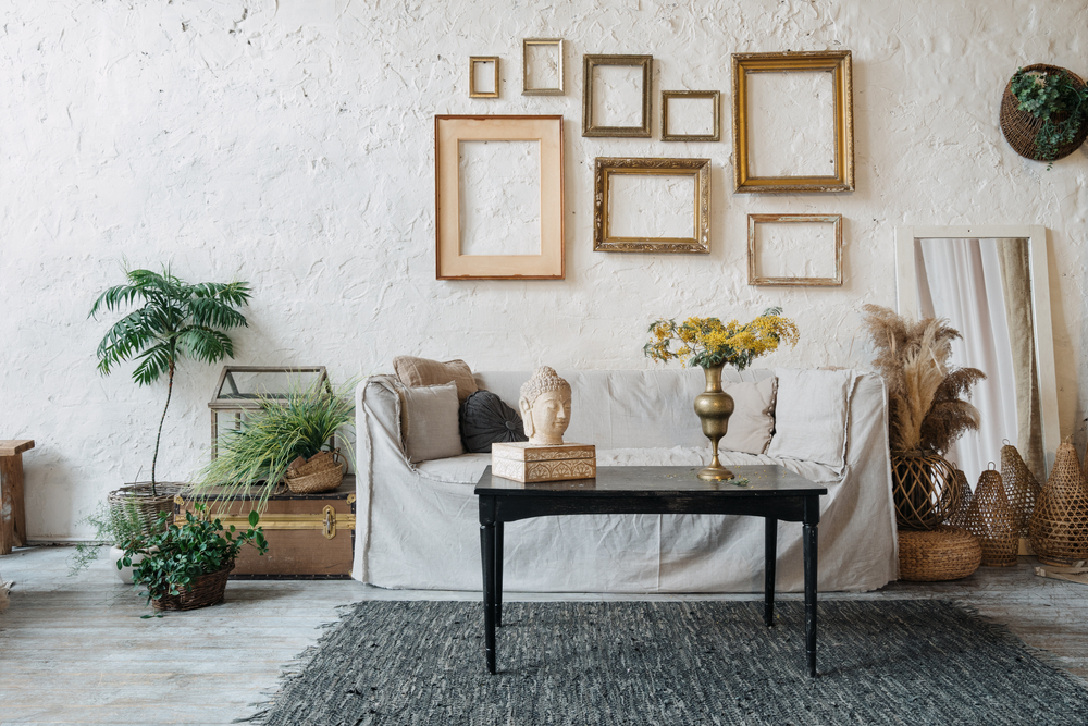 A gallery wall is nothing short of a statement piece in a boho home. It becomes the focal point of the living space and stands out in tasteful ways. Put together an eclectic mix of your favourite photos, art prints, posters, mirrors, tapestry, rug, wall hangings, woven baskets, macrame, and more. Experiment with the size, shapes, and colour – you can even bypass the frame and stick some items directly to the wall. If you have shelves installed, you can display your bohemian collection from your travels, small plants, and figurines. Basically, everything goes.