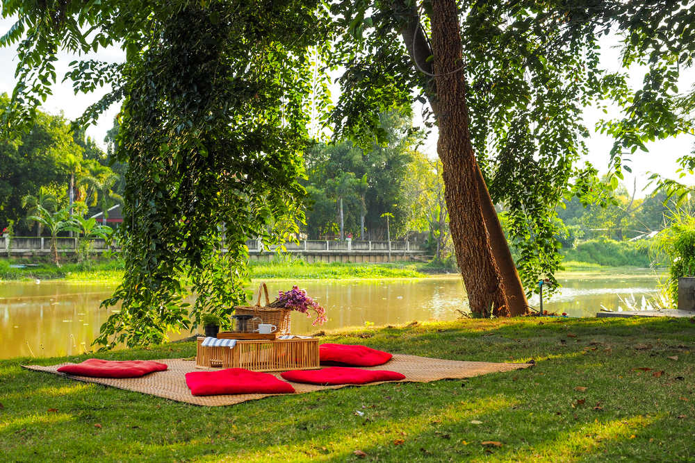 If you have the luxury of space, you can take the party outdoors. You can either do it in your backyard or pick a park. Nature doubles up as the perfect party setting. All you’ll need is a comfortable rug for your picnic-style party and of course, lots of food. You can carry food baskets and comfortable floor cushions as shown in the image below: