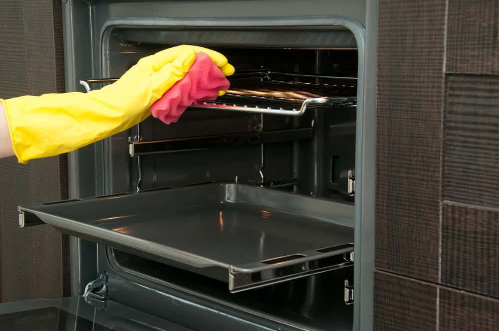 The grimy oven door and glass need some cleaning as well. You can use the same baking soda mixture used for cleaning the dirty oven interior and apply it to the oven window from the inside. Let it rest for an hour before wiping it away with a cloth to make the oven window spick-and-span.