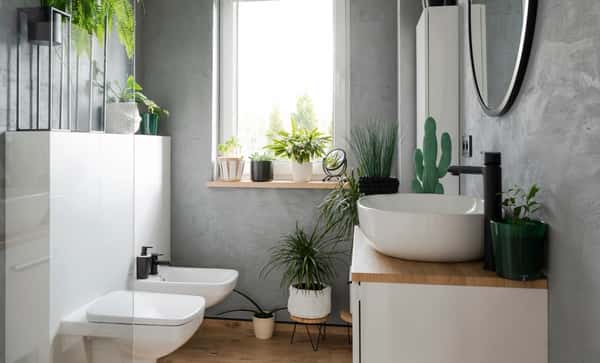 - Adding plants to the counter and in corners will infuse your bathroom with freshness and life. Pick simple ceramic pots or hanging planters for a minimalist touch.