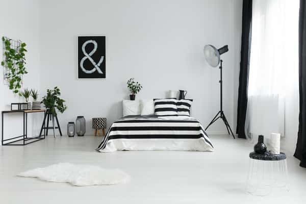 Black and white makes for a dynamic duo that never fails to make an impact. This main bedroom is high on style, and notches up the drama with a graphic striped bed sheet and pillows. Window drapes are all white framed in black, and the sleek furniture falls in line with thin black metal legs.