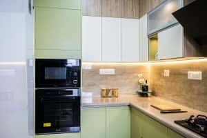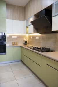 Cool, confident and wonderfully elegant, Archana’s minimalist kitchen is all about clean lines and clutter-free spaces. Matte laminated cabinets in a triad of wood, white and a delightful shade of pastel green are designed without handles, ensuring a seamless look.