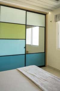 The interplay of colours in the master bedroom is a visual delight, creating a feel-good space that appeals to all the senses. The stunning contemporary wardrobe is fitted with sliding shutters that feature colour-blocked acrylic panels in pretty shades of soft cream, lime green, sky blue and bold aqua. One of the doors incorporates a large mirror in lieu of a separate dressing table; a practical solution that saves on space.