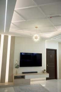 In keeping with the concept of asymmetry that runs through the entire decor, a few of the base units are floor-mounted, while others are wall-mounted. The designer has also added strip lighting underneath to give the unit a floating appearance, and has continued the lighting pattern in the back panel as well for an interesting aesthetic. A plush faux leather sofa in deep brown blends with the colour palette and affords sumptuous, comfortable seating. An arresting crisscross pattern in the ceiling incorporates thoughtfully planned layered lighting, creating different and varying moods throughout the day.