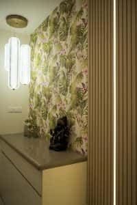 Custom cabinetry fits naturally in the space, with ample space for shoe storage to one side. The centrepiece of the room is the exquisite cut glass crystal chandelier, as Ayushi aptly describes it, “To highlight the space and add a little sparkle, we have chosen this beautiful chandelier!”
