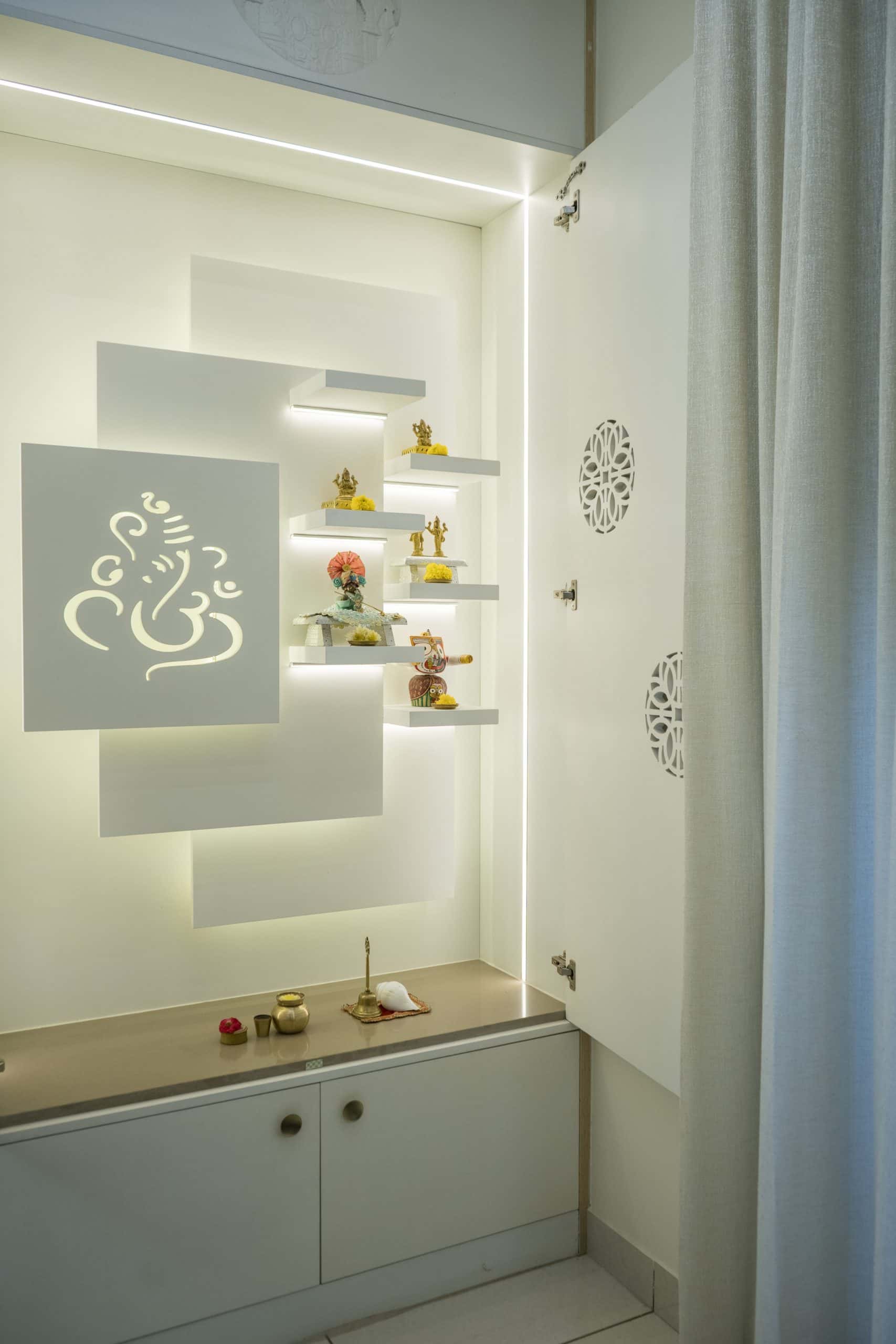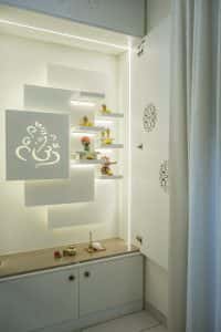 Ayushi tells us that her favourite part of this house is the mandir. And why is it so, may you ask? “Because unlike regular mandir designs, we have kept this one a little asymmetric, continuing the design language of the entire house. We have added layered shelves, and created a dramatic touch with profile lighting strips below the shelves, along the walls and continuing into the ceiling!”