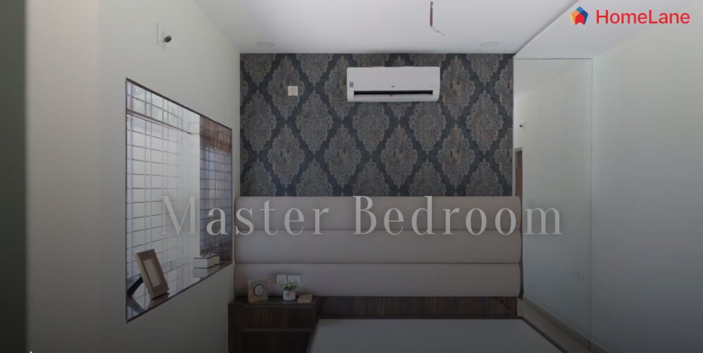 Through smart planning like mirrored walls, low-profile beds, floating shelves, and light-focused home interior design, the compact master bedroom appears spacious and functional.