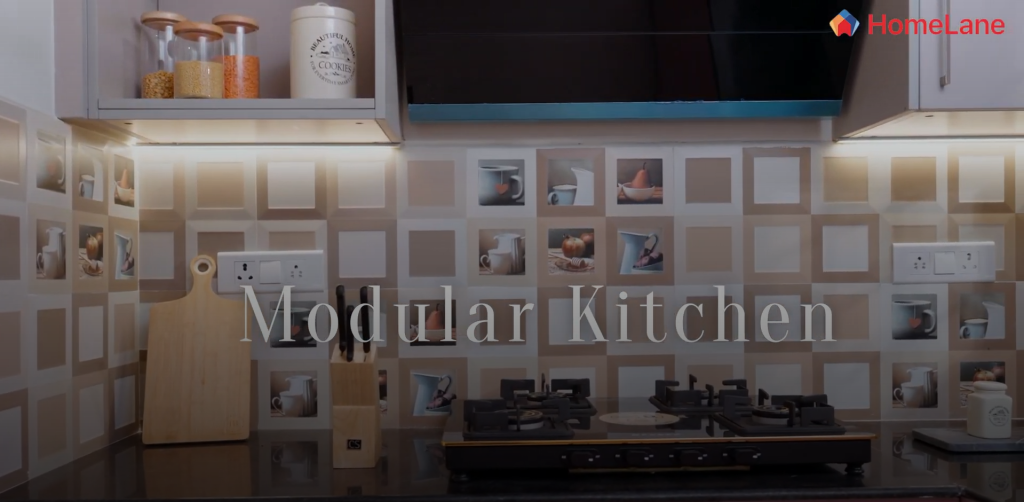 The modular kitchen design includes under-cabinet lighting, a corner L-shaped layout, dedicated spice racks, and a breakfast hatch counter, ensuring both style and efficiency.