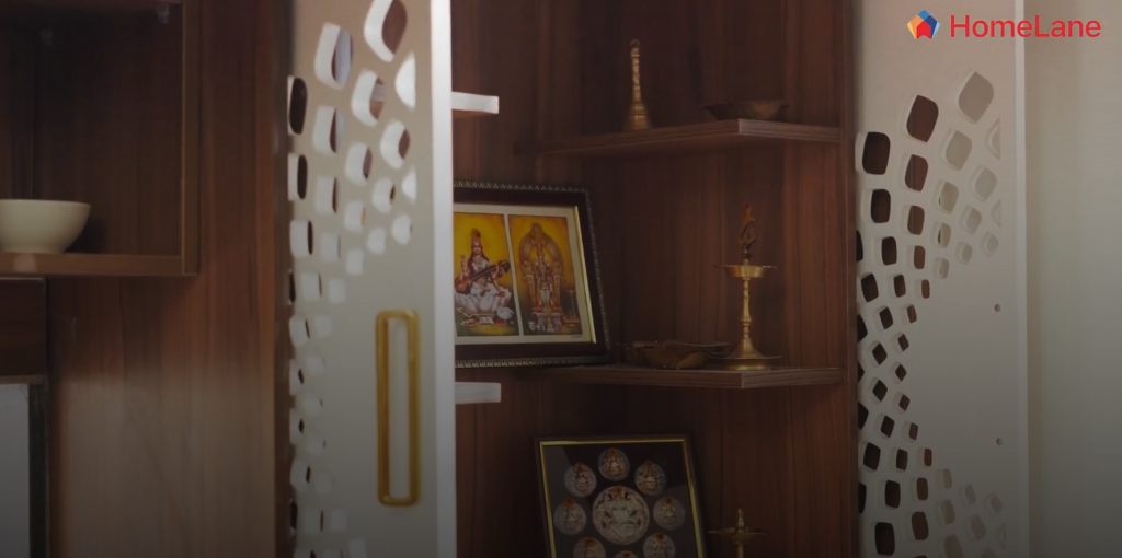 Absolutely. This home features a CNC-cut white pooja cabinet with sliding pocket doors, merging traditional and contemporary interior design in the dining area.