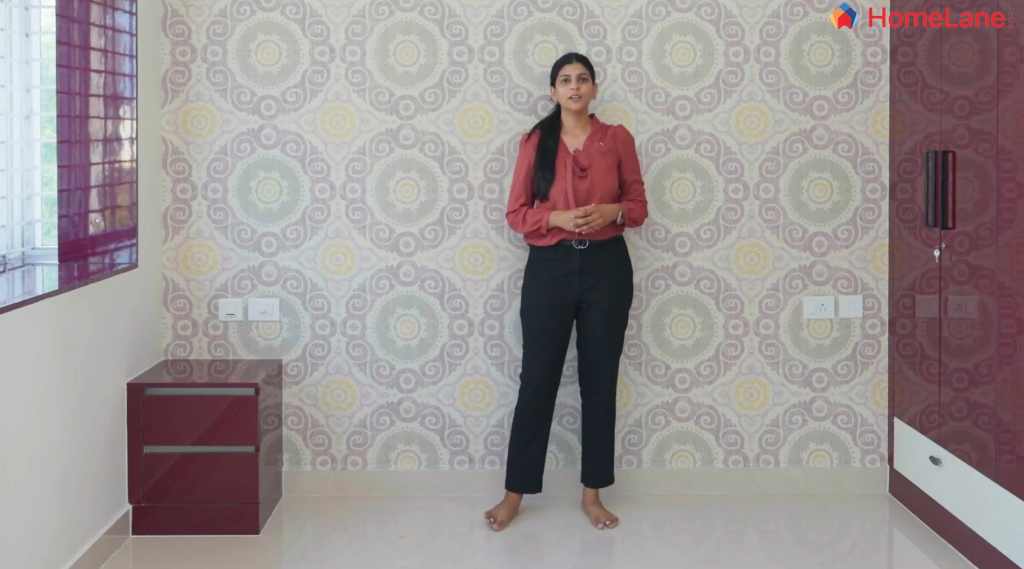 “text”: “This home interior includes mirror-paneled wardrobes, berry-toned laminated shutters, and loft storage, customized to each room’s color palette and function.”