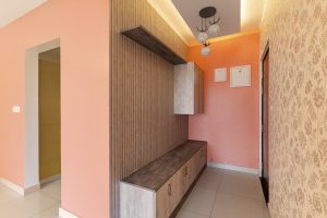 A delicious shade of peach sets the tone in the foyer, oozing warmth and welcoming visitors with open arms. A low, long bench seat is fitted with drawers for footwear below, while floating ledges on the wall hold a display of curated artefacts. Wooden strips are cladded on the wall behind to add a charming hygge touch. On the opposite wall, delicate floral wallpaper that is tinged with gold amps up the luxe vibe.