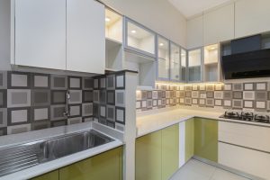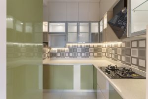 The interplay between lime green and rich ivory creates a lively dialogue in the kitchen, the contrasting colours coming together nicely with the addition of the graphic tiled backsplash. To maximise the potential of vertical space, a second row of cabinets has been added in the upper run, taking the storage all the way till the ceiling. The utility space has been integrated into the kitchen area, rendering it more spacious and enhancing functionality. A small half wall separates the two zones, keeping unsightly clutter in the sink tucked away and neatly hidden from sight.