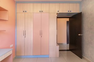 The master bedroom draws upon the same colour palette, using warm peachy shades to evoke a sense of cosy comfort, without compromising on functionality or aesthetics. An unexpected touch of blue in the border all around the wardrobe defines and delineates the unit, making a stunning style statement.