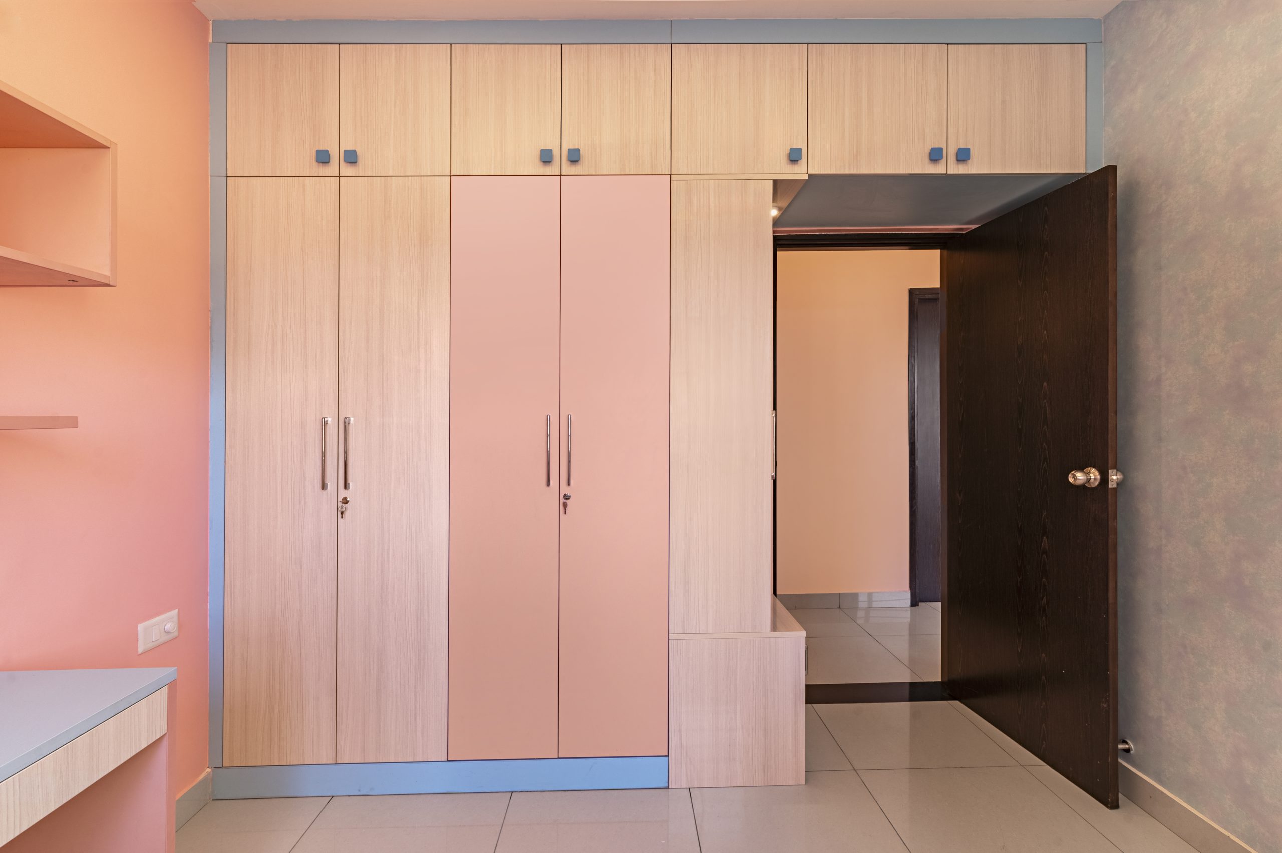 On the adjacent wall, a compact home office is designed with sleek drawers, overhead cabinets and a full-length storage unit with glass shutters. Here, too, a touch of blue offers delightful contrast to the peach palette. The unit provides ample storage space for books, documents, and office supplies, while the glass shutters allow for easy access to frequently used items. The workspace is bathed in natural light from a large window, creating a bright atmosphere that inspires productivity.