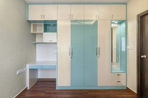 The second bedroom features a stylish wardrobe in a refreshing palette of sky blue and white, accented by sleek high-gloss shutters that exude a modern aesthetic. This multifunctional unit is thoughtfully designed to include a dressing area on one side and a practical workspace on the other, with a convenient loft above providing extra storage space for seasonal items. Long rectangular handles in stainless steel add an elegant touch.