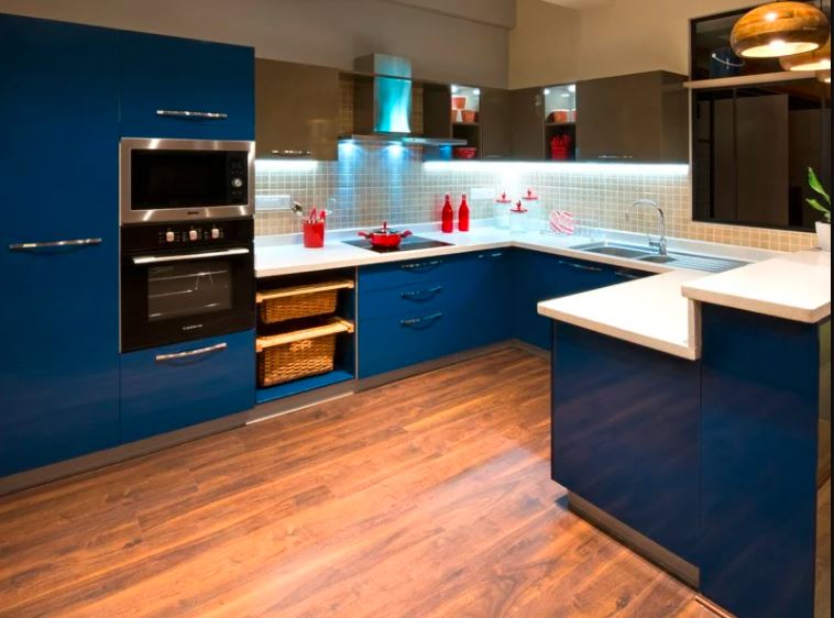 They contain an elegant blue finish, with light-coloured countertops that pop. The kitchen comes fully equipped with perfect segregations for cleaning and cooking areas.