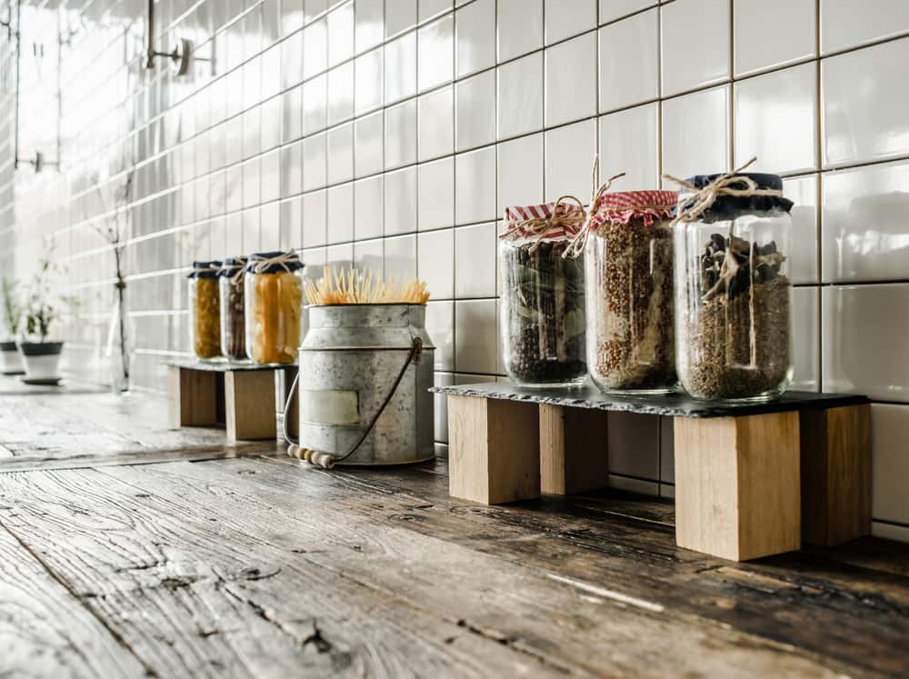 If you are someone who loves retro and often reminisces about how wonderful everything was in your grandma’s time, the following design suggestion is perfect for your aesthetic sensibilities. Combine the use of simple small kitchen tiles and use a gorgeous wooden kitchen table as your space for (cooking) art. You can always use jute jars with printed cloths as shown here: