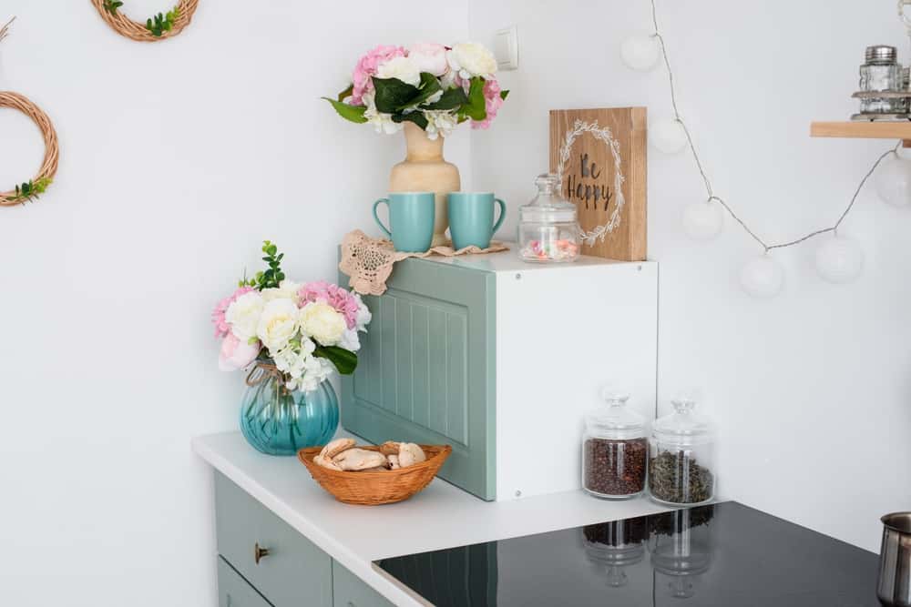 Adding a touch of fresh flowers can instantly and literally liven up your kitchen space. If your cabinets are inherently painted in pastel shades, consider the following kitchen decor style. Place fresh flowers on the kitchen countertop and let your kitchen give out summery spring and cheerful vibes: