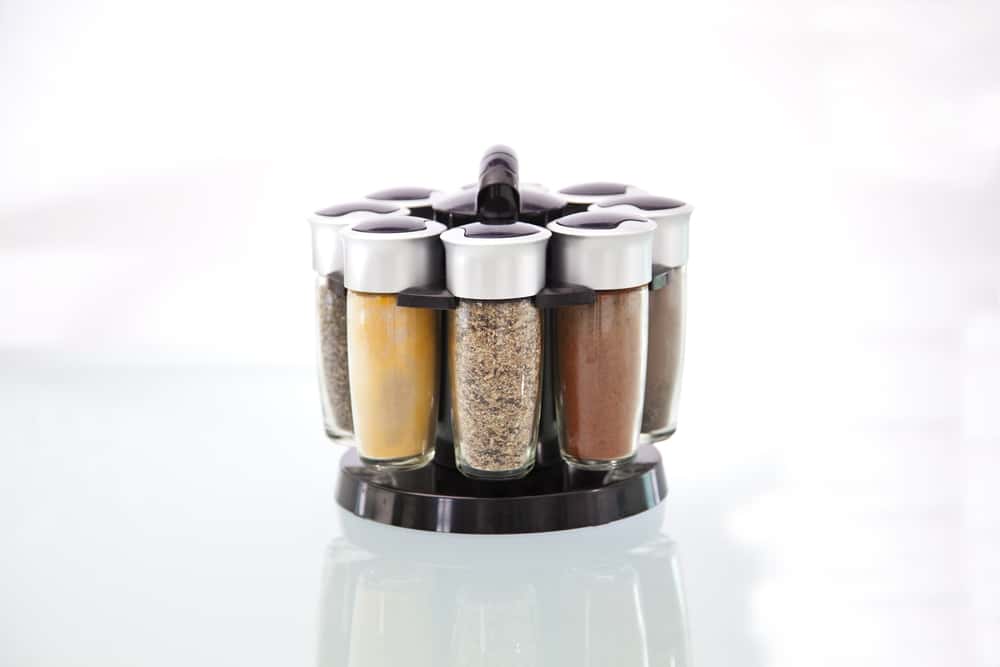 There are also rotating spice racks that require very little space and provide easy access to the spices and other condiments.